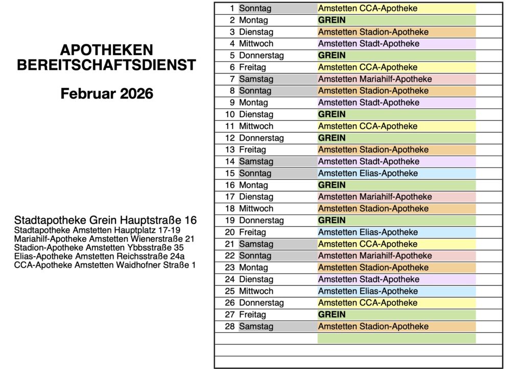 APOTHEKENBEREITSCHAFTSDIENST: werktags ab 18 Uhr, Wochenende ab Samstag 12 Uhr